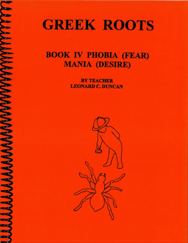 In Duncan's 'Greek Roots Book IV Phobia And Mania' the roots phobia and mania (fear & desire) and varied affixes are used to teach words that deal with fears and desires such as agoraphobia, bibliomania, pyromania and xenophobia. Mastery of these roots and affixes enables the reader to increase their vocabulary twofold. 8.5" x 11" spiral bound workbook illustrated by artist Holly Bigelow.
