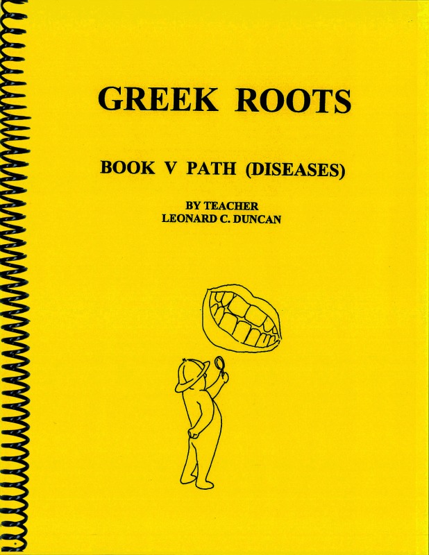 In Duncan's 'Greek Roots Book V Path' the root path (diseases) and varied affixes are used to teach words that deal with health such as trichosis, neurosis, acne, bronchitis, etc. Mastery of this root and the many affixes enables the reader to increase their vocabulary threefold. 8.5" x 11" spiral bound workbook illustrated by artist Holly Bigelow.